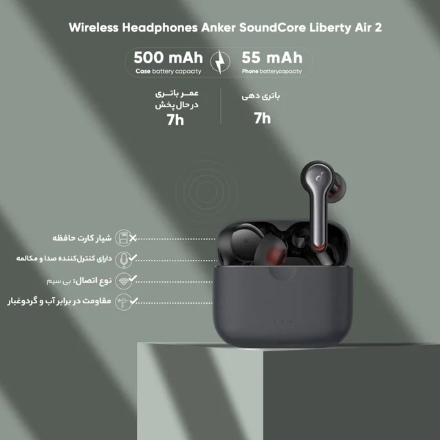 هدفون بیسیم انکر SoundCore Liberty Air 2 با اتصال بلوتوث، تجربهای عالی برای گوش دادن به موسیقی و مکالمه فراهم میکند. طراحی سبک و مقاوم در برابر رطوبت و گردوغبار، استفاده در هر مکان از جمله ورزش را ممکن میسازد. باتری گوشیها بیش از ۷ ساعت دوام دارد و محفظه شارژ ۵۰۰ میلیآمپری زمان استفاده را افزایش میدهد. این هدفون انتخابی ایدهآل برای فرار از سروصدای بیرون و لذت بردن از موسیقی در خانه یا بیرون است.