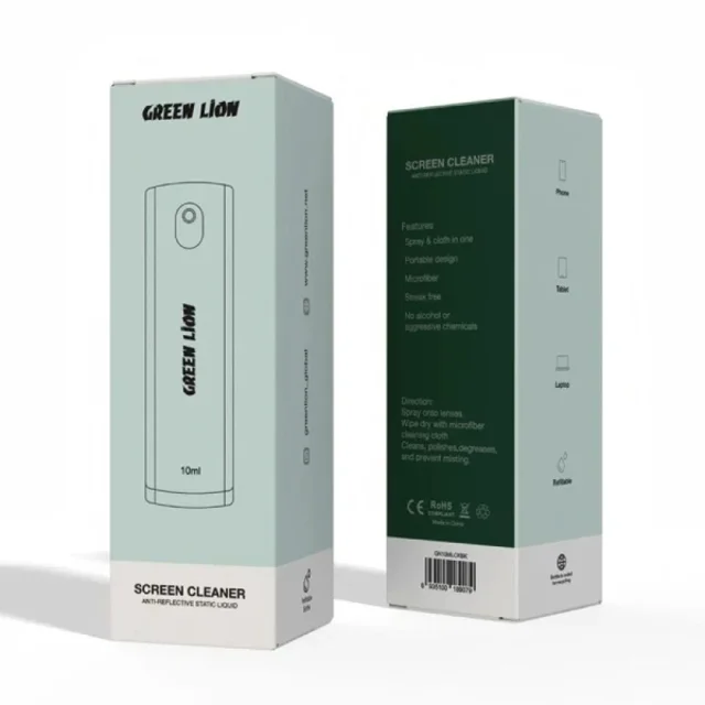 تمیزکننده صفحه نمایش Green Lion با حجم ۱۰ میلیلیتر، یک ابزار کاربردی، جمعوجور و قابل شارژ است که برای تمیز کردن انواع نمایشگرها طراحی شده. این محصول دارای بدنهای سبک و قابل حمل است که در کیف یا جیب جا میگیرد. اسپری آن بدون الکل و مواد شیمیایی خشن ساخته شده تا بدون ایجاد خط و خش یا لکه، نمایشگر را کاملاً تمیز کند. در کنار اسپری، یک پارچه میکروفایبر باکیفیت نیز تعبیه شده که بهصورت مستقیم روی بدنه نصب است.