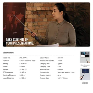 اگر به دنبال خرید پرزنتر بیسیم گرین لاین Wireless Presenter GL-WP11 هستید که ارائه شما را از یک سخنرانی ساده به یک تجربه تعاملی و بهیادماندنی تبدیل کند، این دستگاه با اشارهگر لیزری و قلم لمسی خازنی دقیقاً همان چیزی است که نیاز دارید. این محصول هوشمند در دسته لوازم جانبی کامپیوتر و ورودیها قرار میگیرد و به متخصصان، مربیان و دانشجویان امکان میدهد کنترل کامل و دقیق بر ارائه خود داشته باشند.