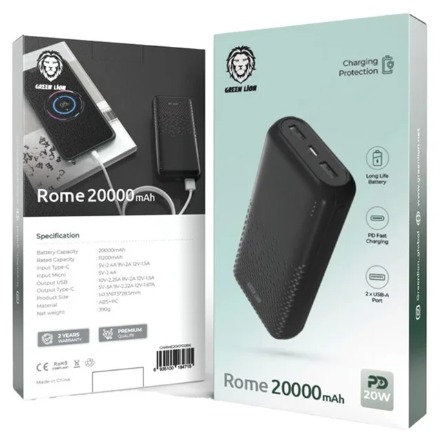 پاوربانک Green Lion Rome 20000 با ظرفیت ۲۰۰۰۰ میلیآمپر ساعت، یکی از محصولات جدید ۲۰۲۴ این برند است. طراحی جمعوجور با ابعاد 141.5×67.5×28.5 میلیمتر و وزن 390 گرم آن را برای حمل روزانه مناسب میسازد. این پاوربانک دارای خروجیهای USB-A و USB-C و ورودی USB-C است و حداکثر توان خروجی 20 وات را با پشتیبانی از فناوریهای Quick Charge و Power Delivery ارائه میدهد. چهار چراغ LED میزان شارژ باقیمانده را نمایش میدهند. به لطف این ویژگیها، میتوانید، دستگاههای خود را سریع و مطمئن شارژ کنید.