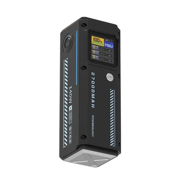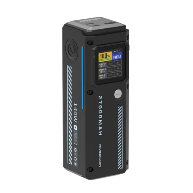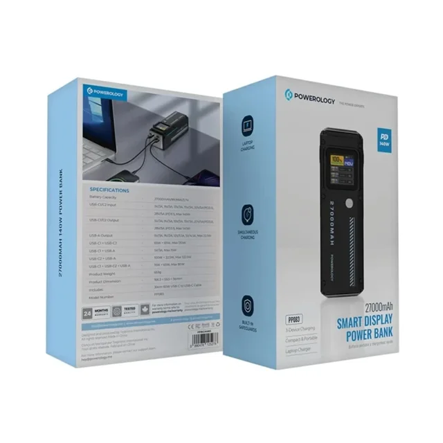 پاوربانک هوشمند Powerology 27000mAh با ظرفیت 27000 میلیآمپر ساعت و خروجی کلی تا 140 وات، قدرت شارژ بالایی دارد. این پاوربانک دارای دو پورت USB-C و یک پورت USB-A است که میتواند چندین دستگاه را به طور همزمان شارژ کند. پورتهای ورودی و خروجی USB-C از ولتاژهای بالا مانند PD 3.0 و PD 3.1 برای شارژ سریع پشتیبانی میکنند و میتوانند تا 28 ولت/5 آمپر جریان ارائه دهند. این پاوربانک با یک کابل 30 سانتیمتری 60 واتی USB-C به USB-C، برای لپتاپها، گوشیهای هوشمند و موارد دیگر ایدهآل است.